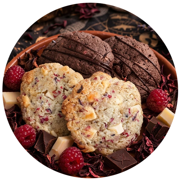 Je crée différents cookies botaniques artisanaux, où la douceur du sucre enlace la magie des herbes aromatiques. Ici, la lavande flirte avec le citron, le romarin caresse le chocolat, et chaque fleur raconte une histoire cueillie au bon moment.
